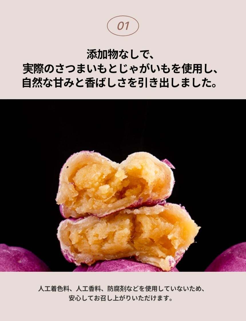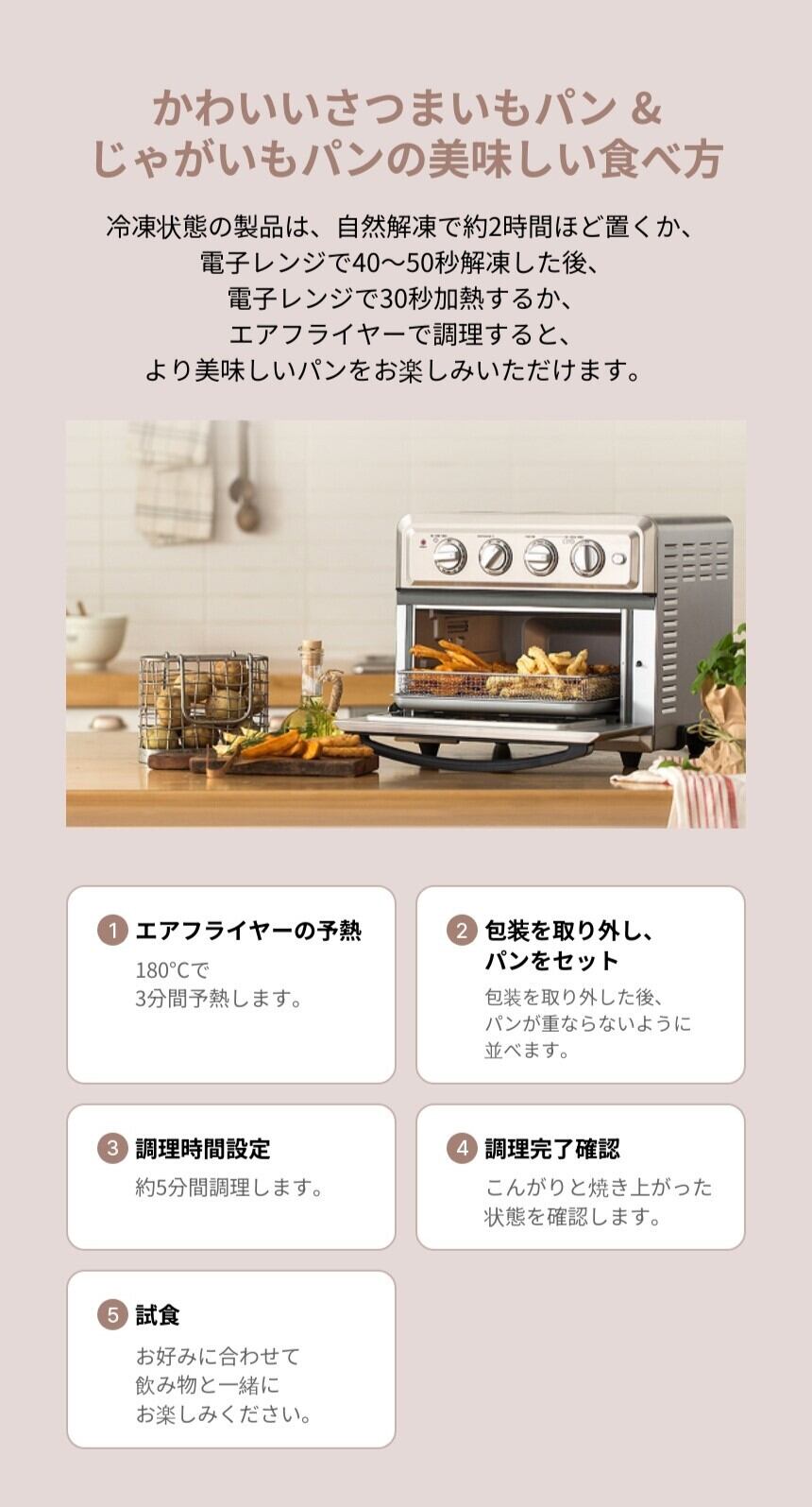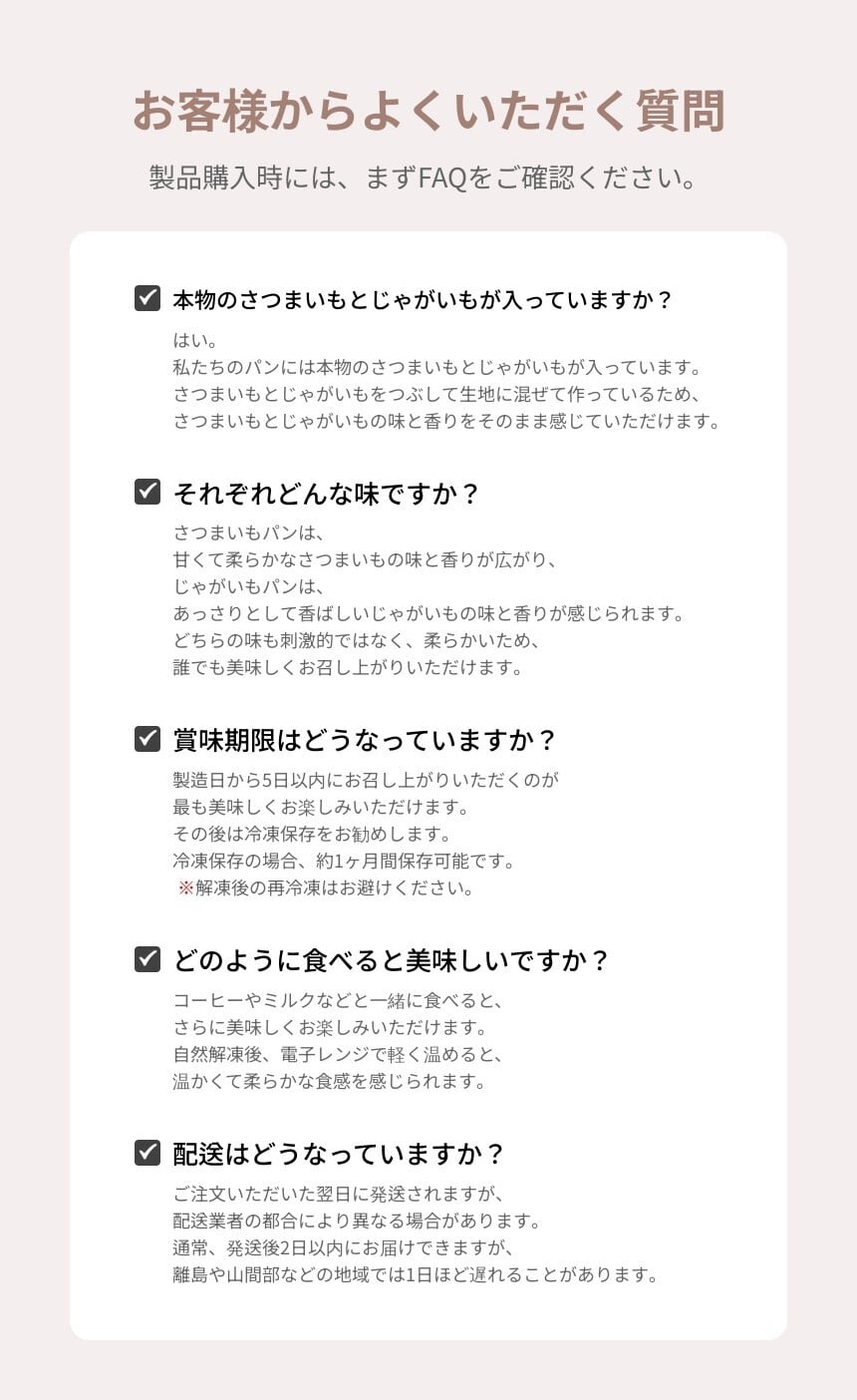 名:ジャガイモパン 名称:ガムジャパン 原材料名:タピオカ粉、 小麦粉、バター、塩、卵、 大豆粉、じゃがいも、砂糖、 胡椒、ゴマ 内容量:110g 賞味期限:製造日より 冷凍: 21日 冷蔵: 7日 常温: 5日 保存方法:直射日光を避け、常温で保存。 開封後はお早めにお召し上がりください。 ・冷蔵:600Wで30秒 ・冷凍:解凍1分10秒後、600Wで45秒