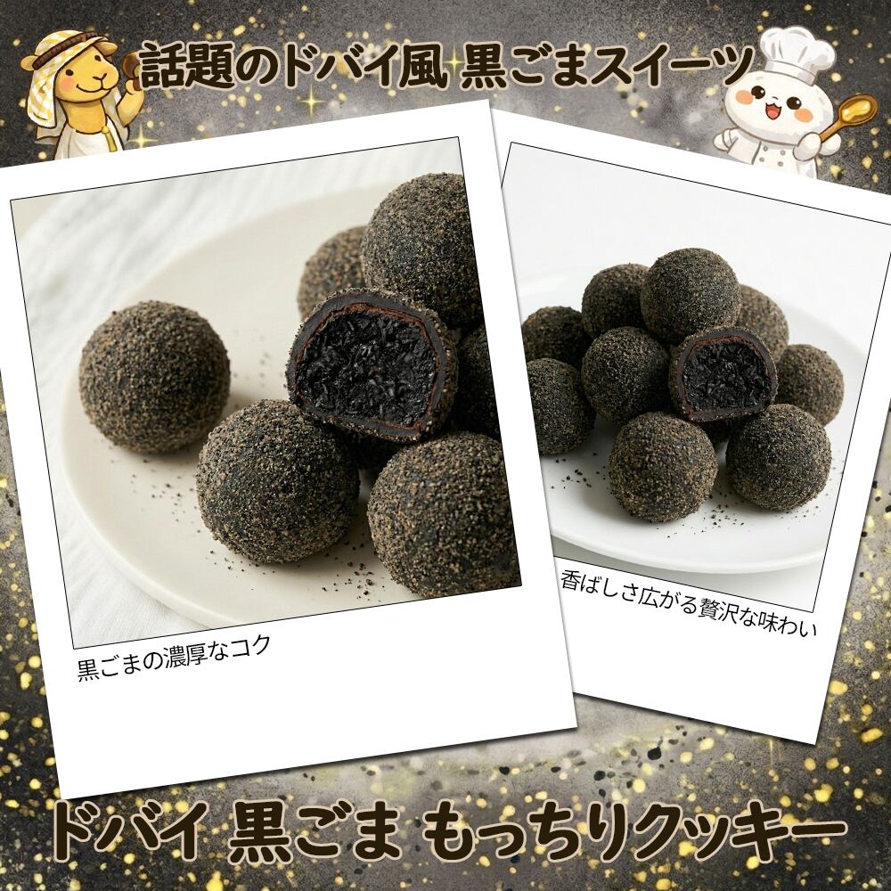 ・商品名:ドバイ もっちりクッキー ・フレーバー:黒ごま/チョコレート ・内容:個包装 ・タイプ:洋菓子/クッキー ・特徴:もっちり食感、ドバイスタイルチョコ使用 ・用途:ギフト、プレゼント、プチギフト、おやつ